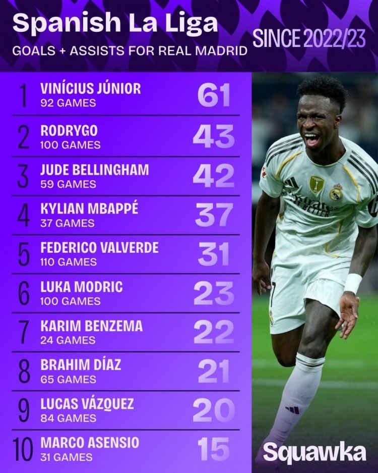 近3年皇马西甲参与进球榜:维尼修斯92场61球领跑 姆巴佩37场37球_腾讯新闻