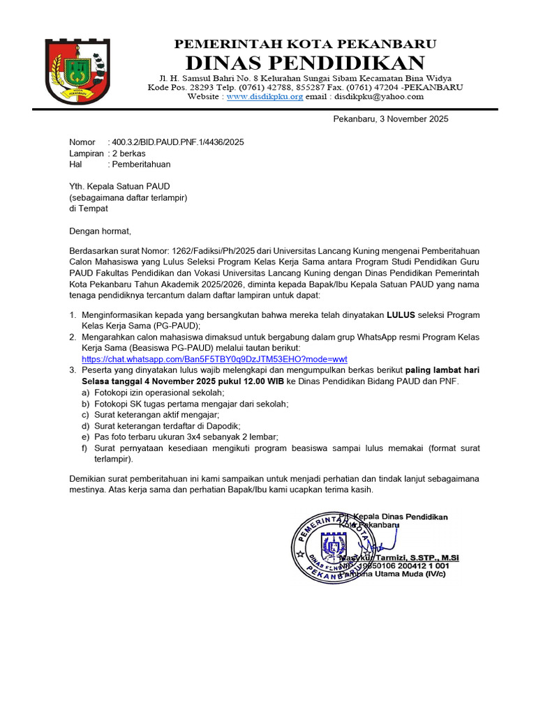 Surat Pemberitahuan Calon Mahasiswa PG Paud Unilak Beasiswa Pemko ...