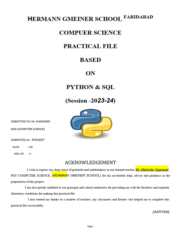 PRACTICAL FILE FRONT PAGE - 12th CS With Python | PDF