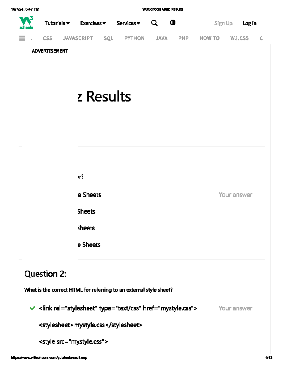 Cssw3s - notes - 8:47 PM W3Schools Quiz Results 3 Tutorials Exercises ...