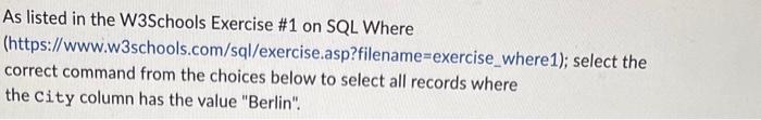 Solved As listed in the W3Schools Exercise \#1 on SQL Where | Chegg.com