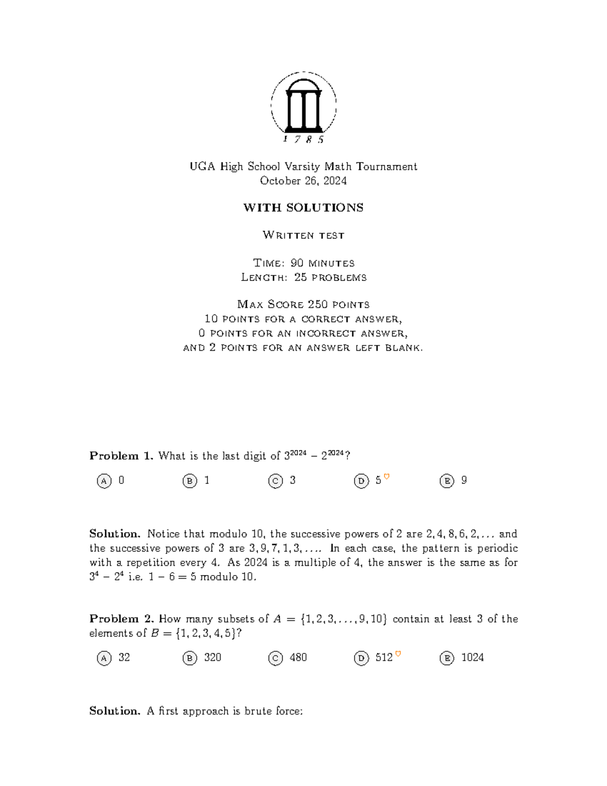 UGA High School Varsity Math Tournament Solutions - Oct 2024 - Studocu