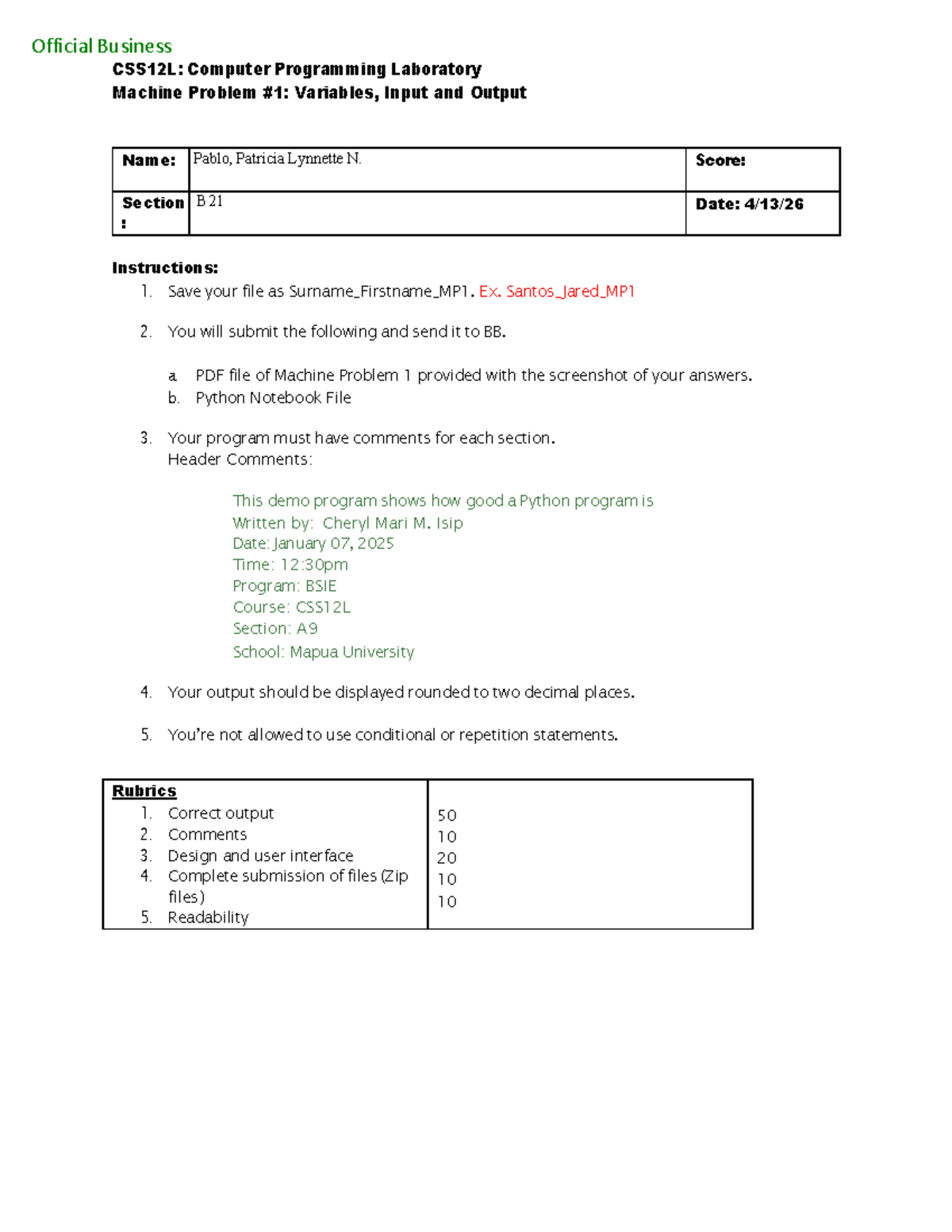 CSS12L: Computer Programming Lab - Machine Problem 1 on Variables and I ...