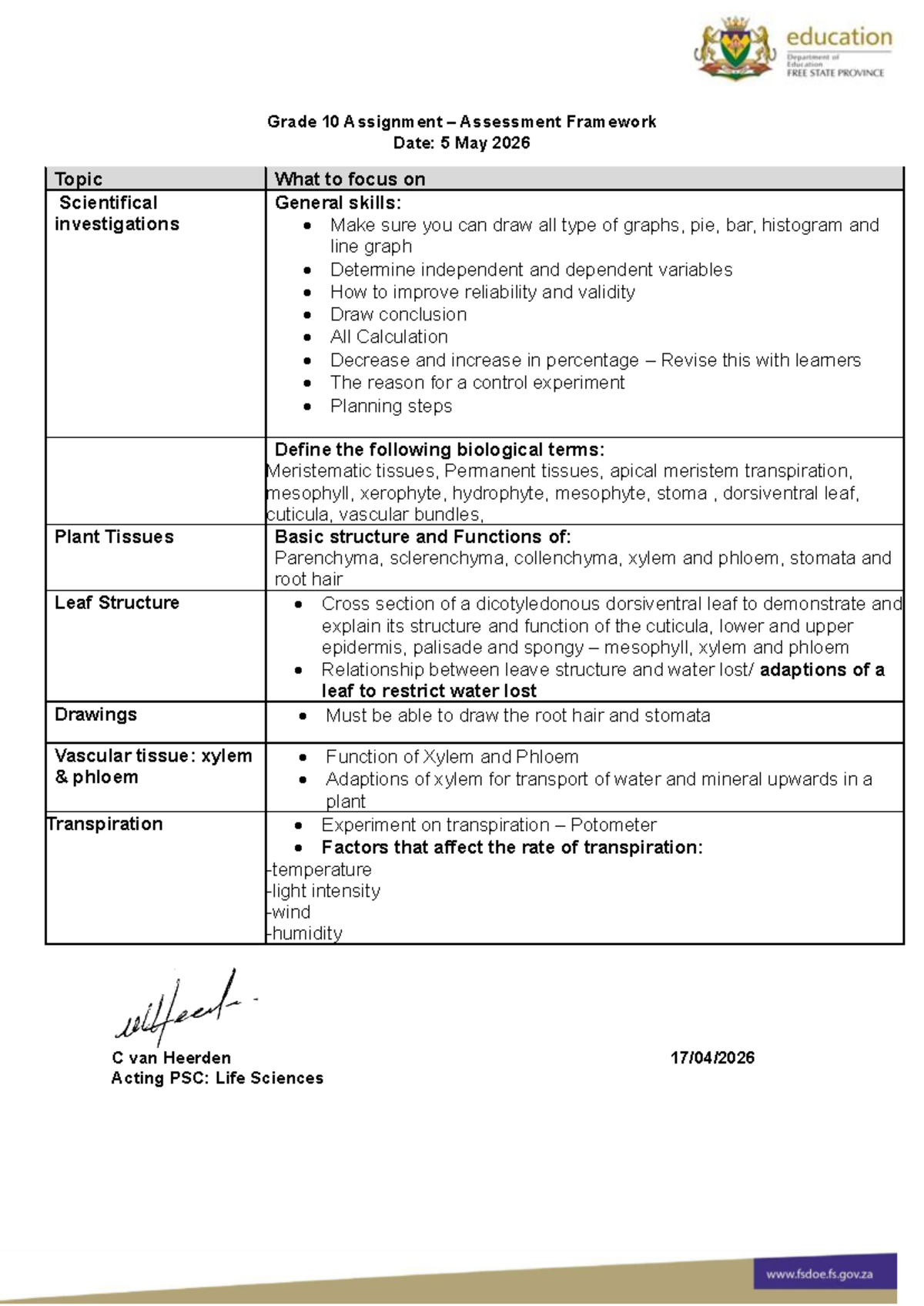 LFSC GR 10 Assignment: Plant Tissues & Transpiration Study Guide - Studocu