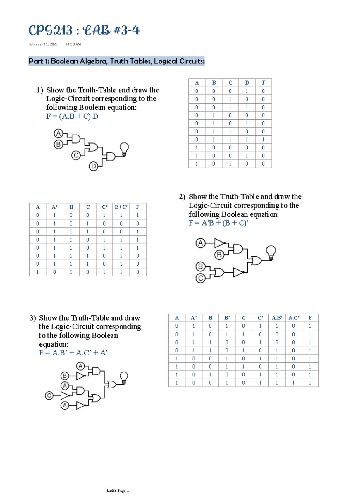 CPS213: Lab Assignment 3 - Boolean Algebra & Logical Circuits - Studocu