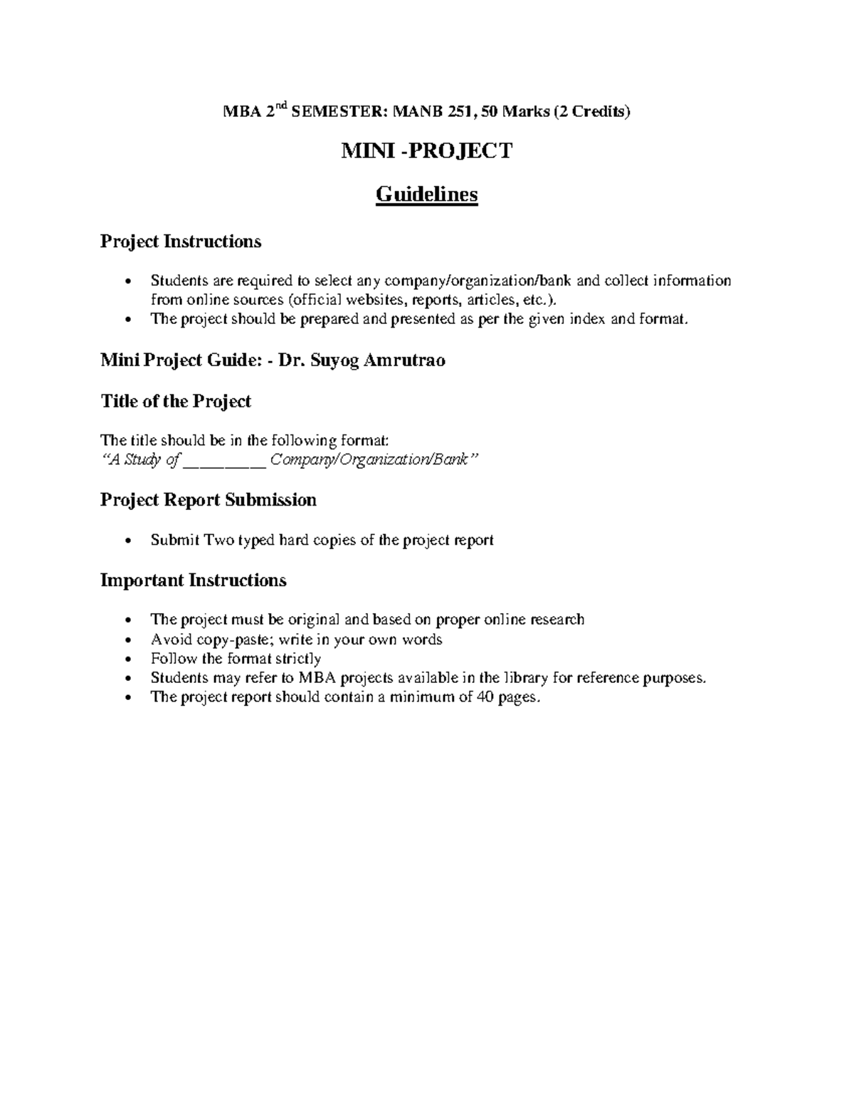 MBA 2nd SEM: MANB 251 Mini Project Guidelines and Details - Studocu