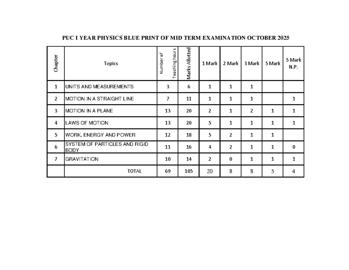 PUC I YEAR PHYSICS MID TERM EXAM BLUEPRINT OCT 2025 - Studocu