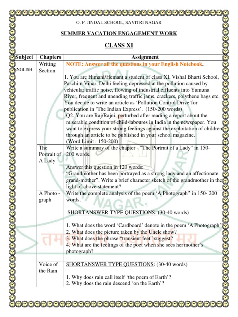 Class XI Summer Homework Guide | PDF