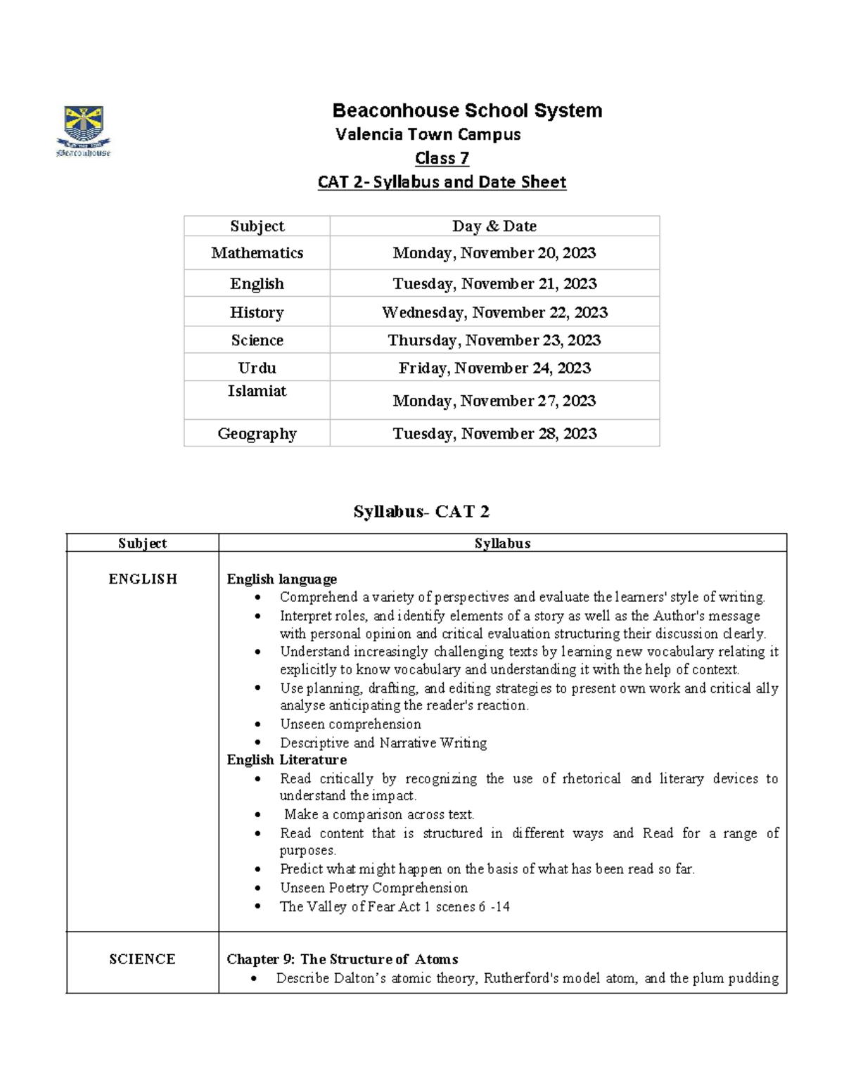 Class 7 CAT 2 Syllabus & Date Sheet - Beaconhouse School System - Studocu