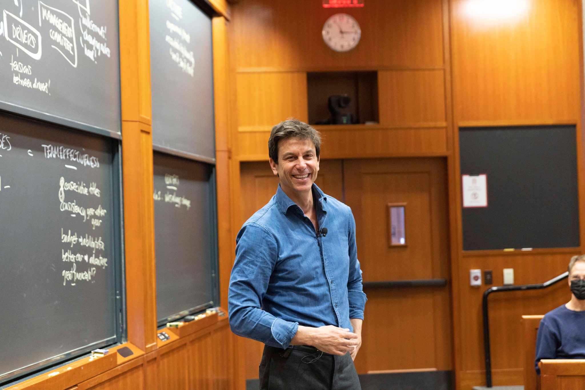 Based on this image's title: “Toto Wolff to lecture at Harvard Business School”