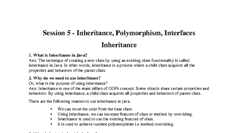 Inheritance, Polymorphism & Interfaces in Java - Session 5 Notes - Studocu