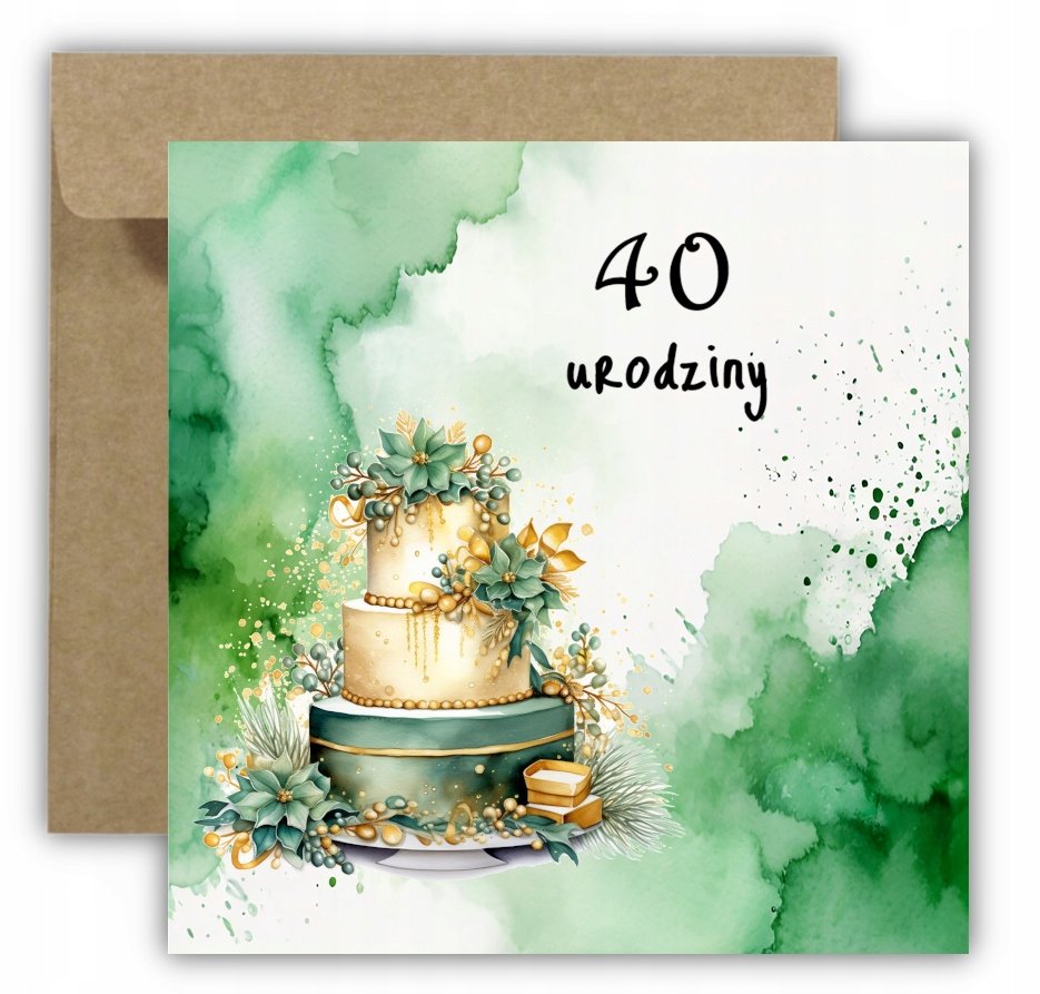 Kartka na 40 urodziny urodzinowa z liczbą tort kwiaty złote zielone ...