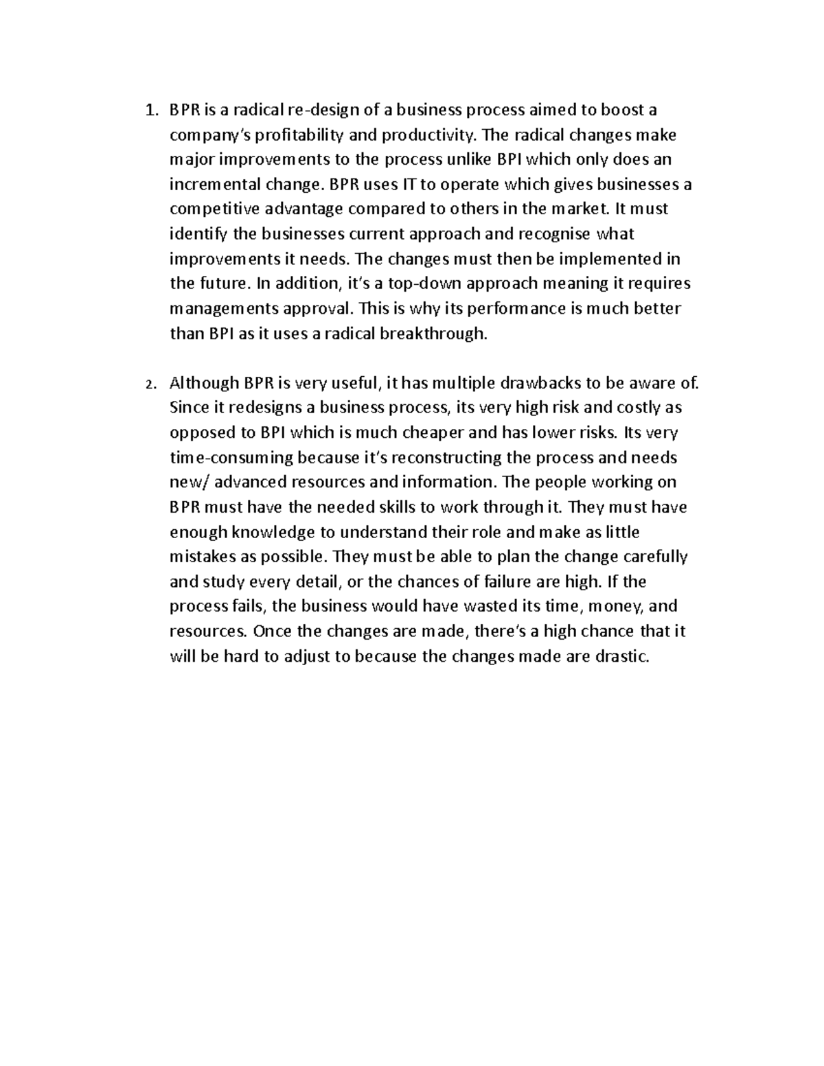 Week 3 quiz - answer - BPR is a radical re-design of a business process ...