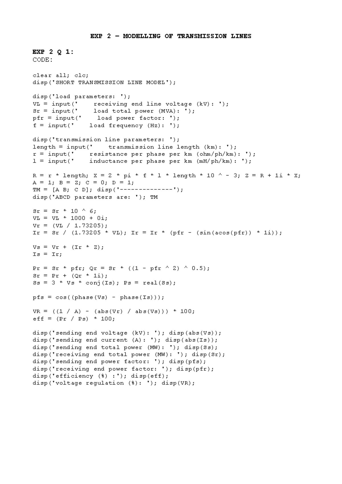 EXP 2: Modelling and Performance Analysis of Transmission Lines - Studocu
