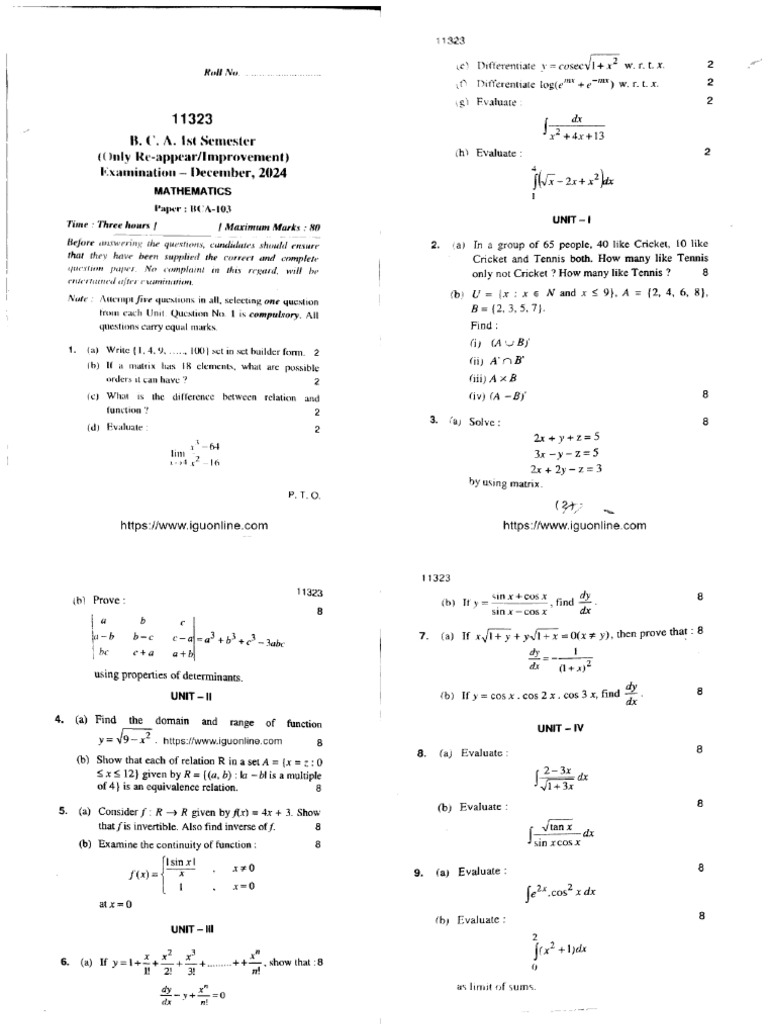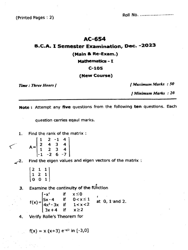 BCA 1st Sem Maths Question Paper 2023 | Previous Year Question Paper ...