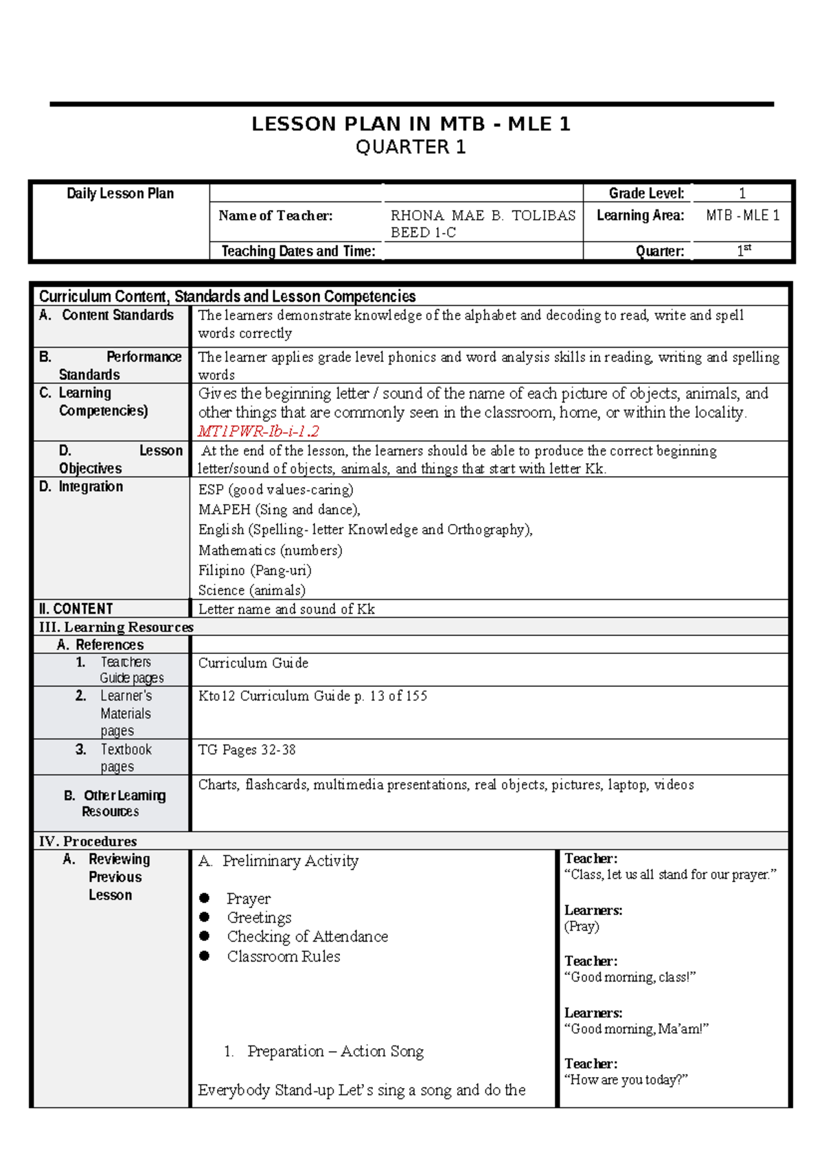 MTB MLE 1 Lesson Plan for 1st Quarter: Letter Kk Activities - Studocu