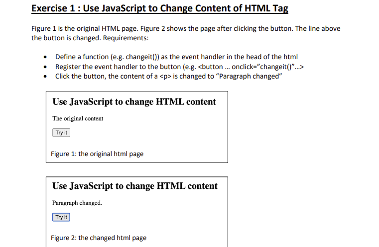 Based on this image's title: “Solved Exercise 1 : Use JavaScript to Change Content of HTML | Chegg.com”