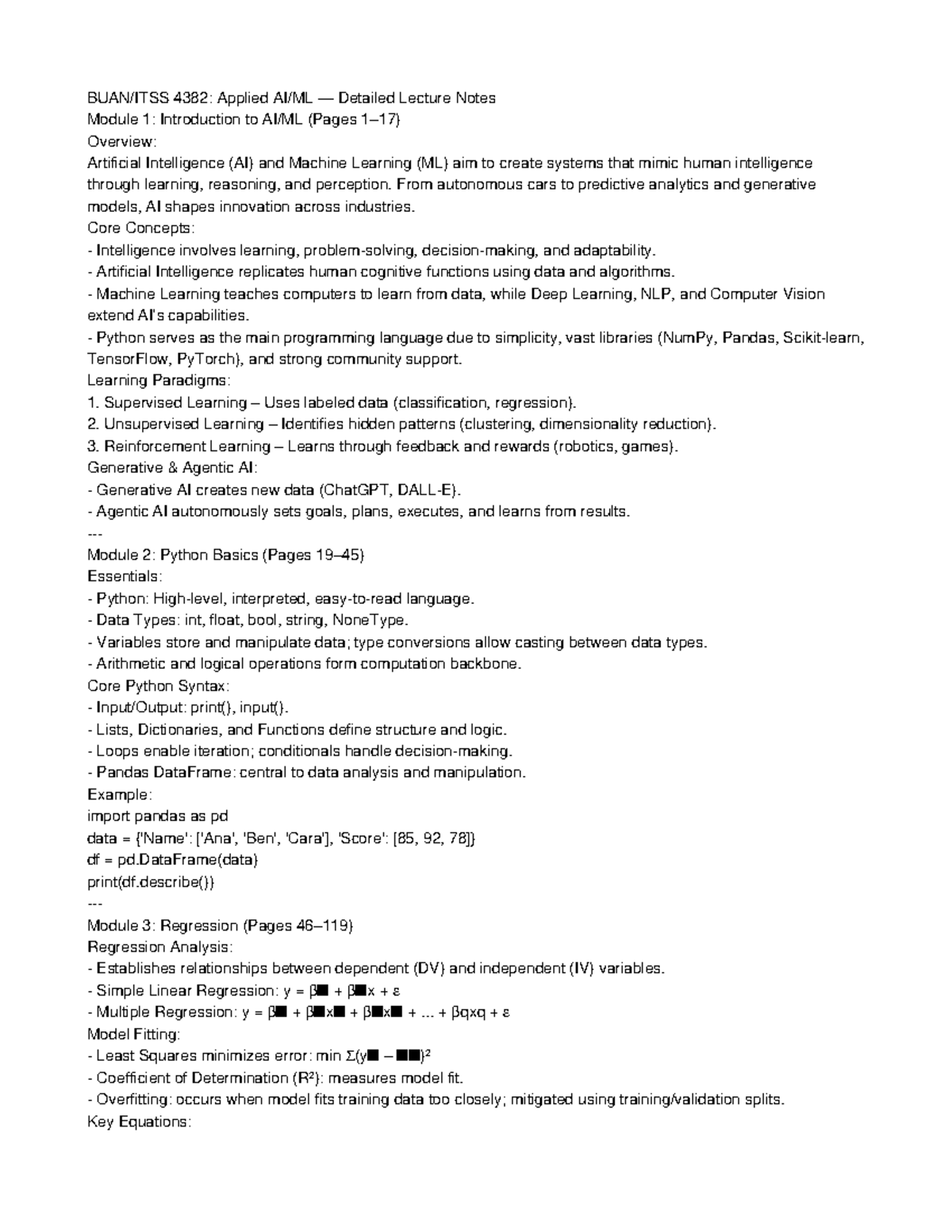 BUAN ITSS 4382 Detailed Lecture Notes: AI & ML Module 1 Overview - Studocu