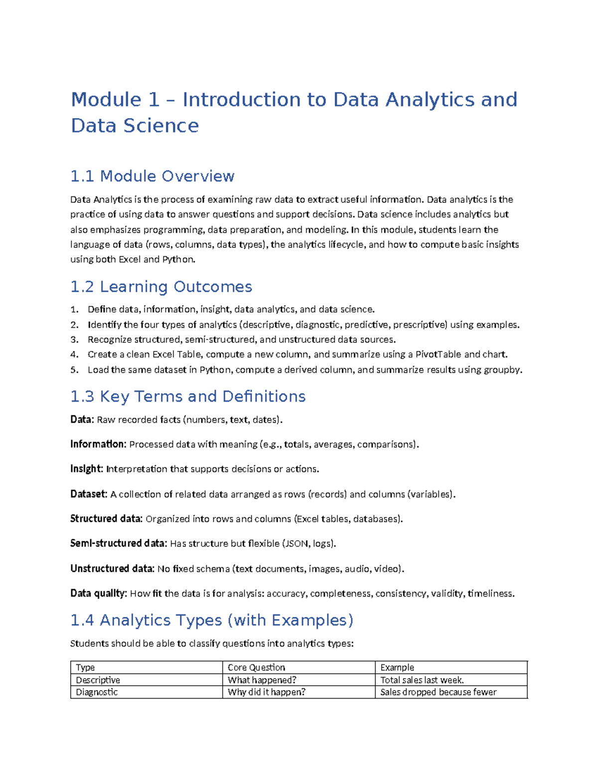 Module 1: Intro to Data Analytics & Data Science Overview - Studocu