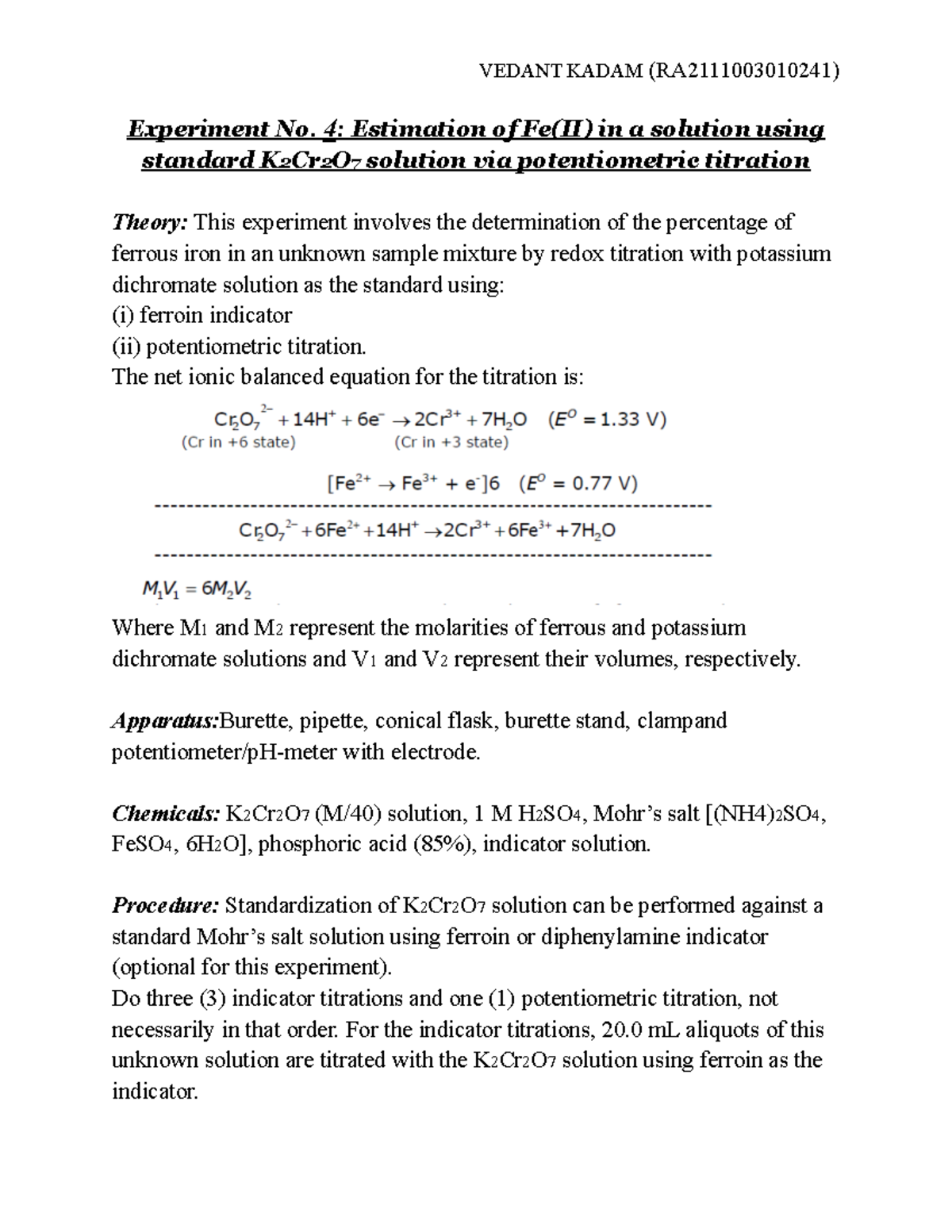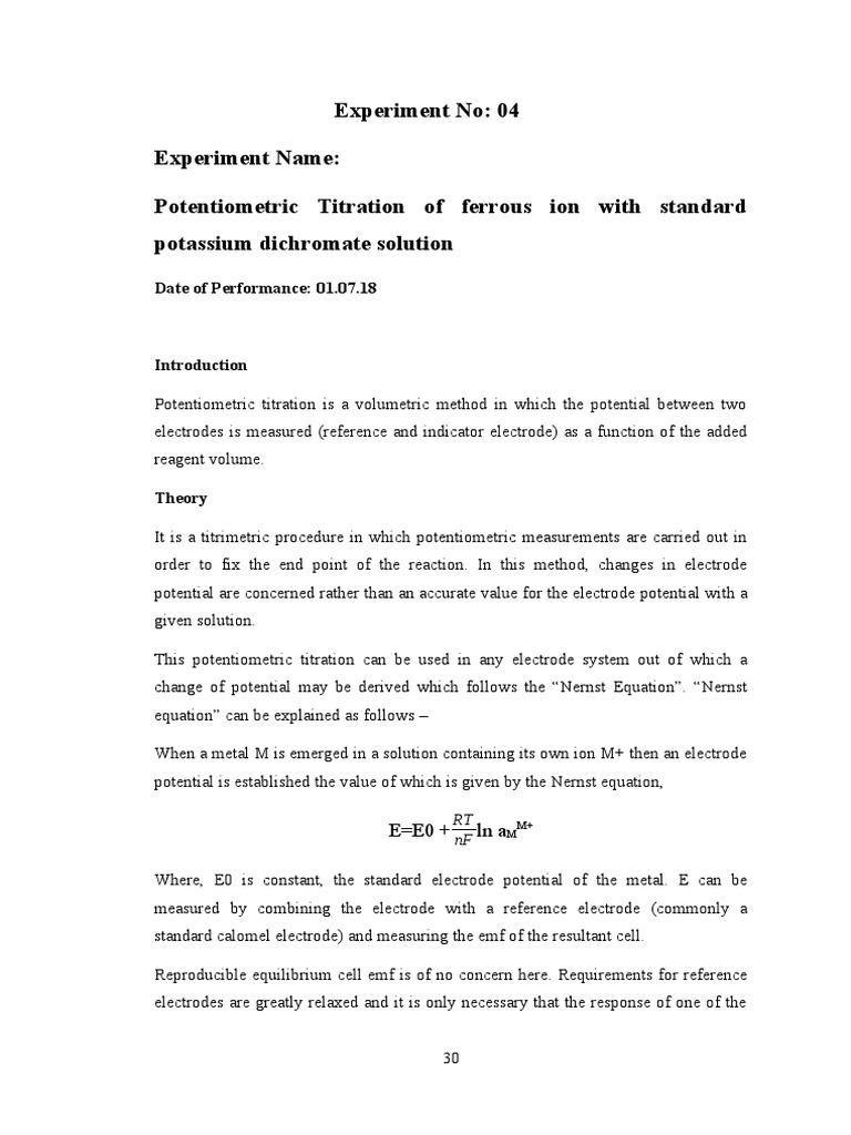 Estimation of Fe(II) via Potentiometric Titration (Experiment 4) - Studocu