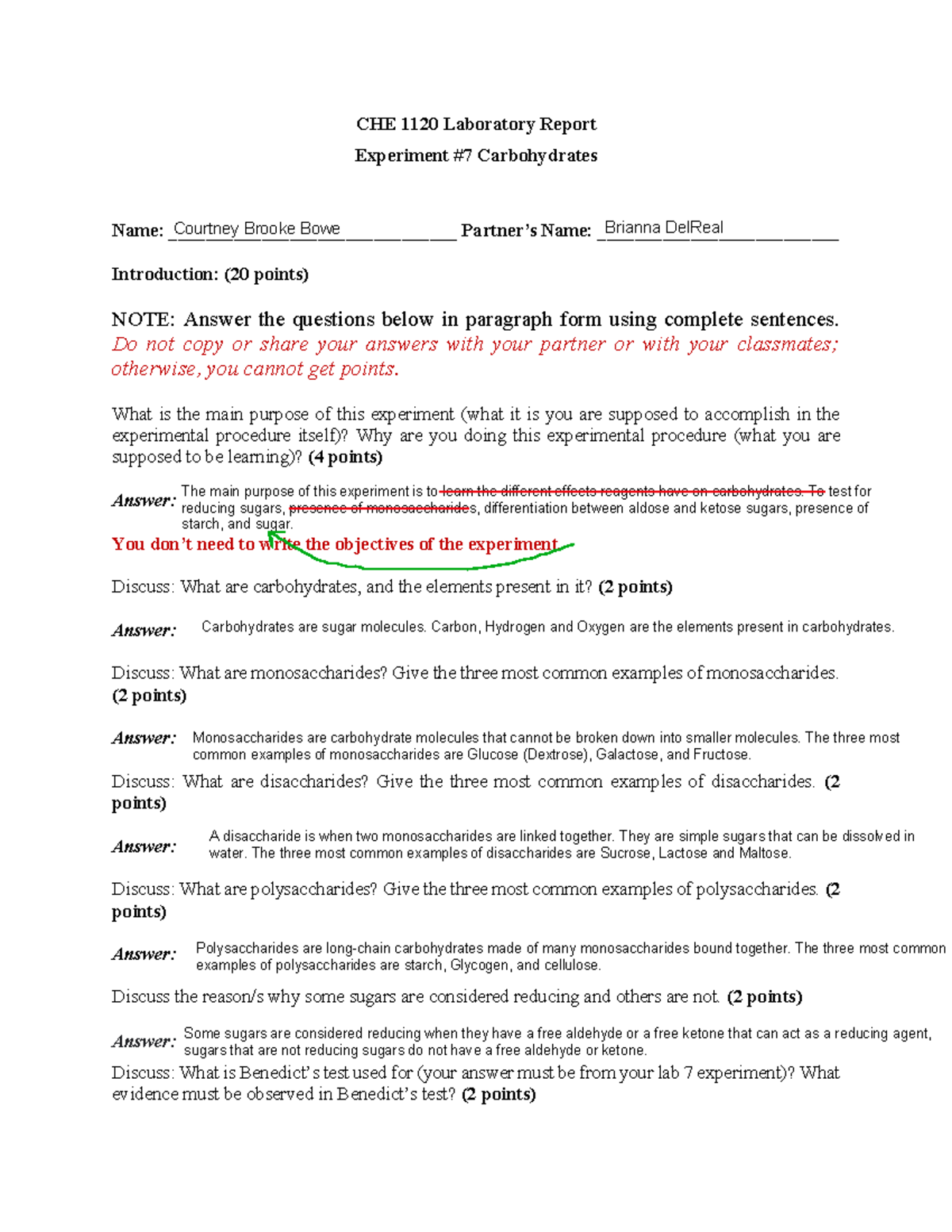 Carbohydrates lab - CHE 1120 Laboratory Report Experiment #7 ...