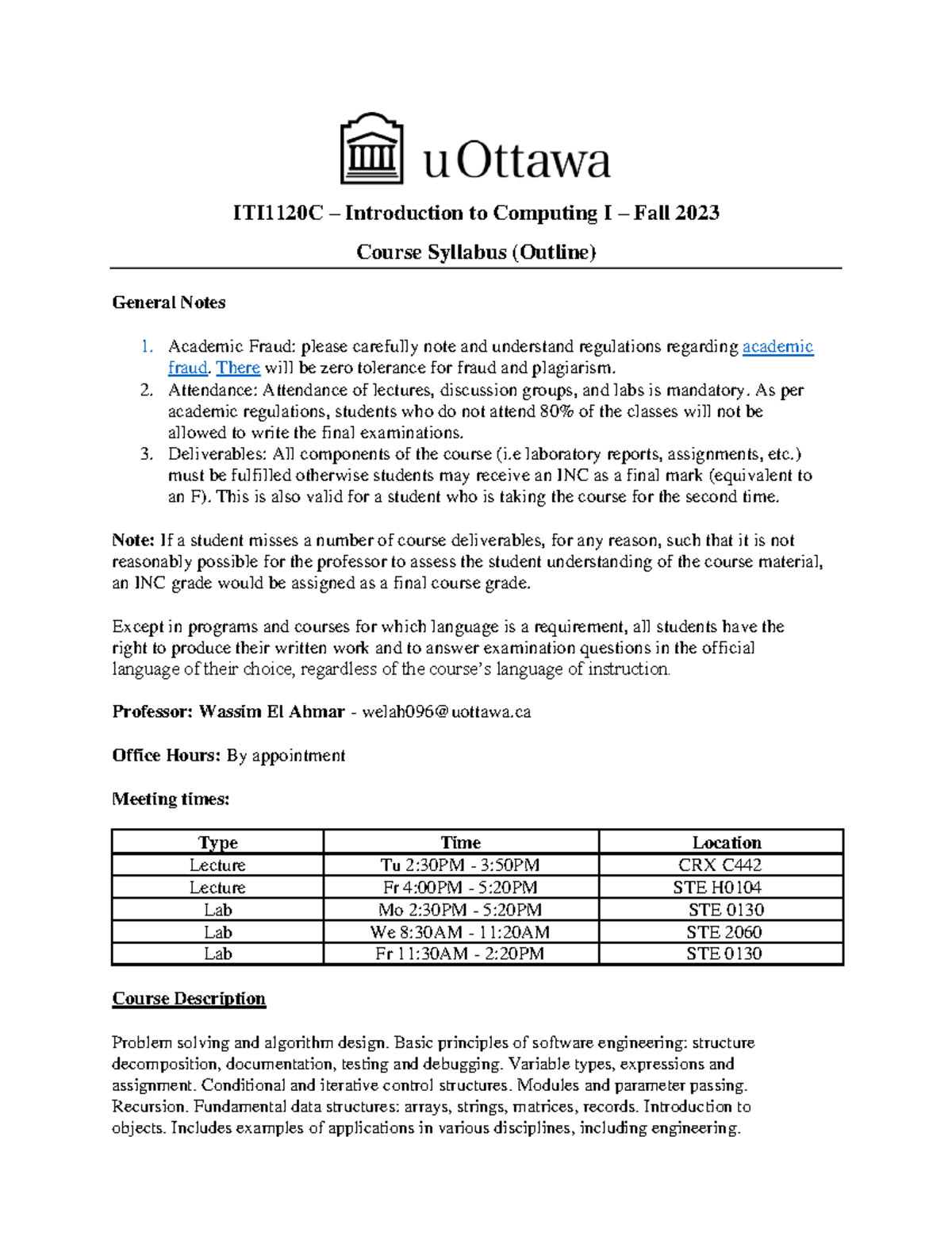 ITI-1120 Syllabus - ITI1120C – Introduction to Computing I – Fall 202 3 ...
