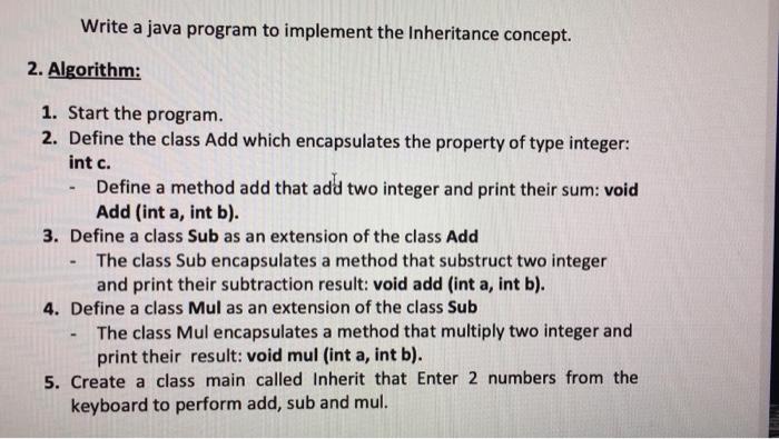 Solved Write a java program to implement the Inheritance | Chegg.com