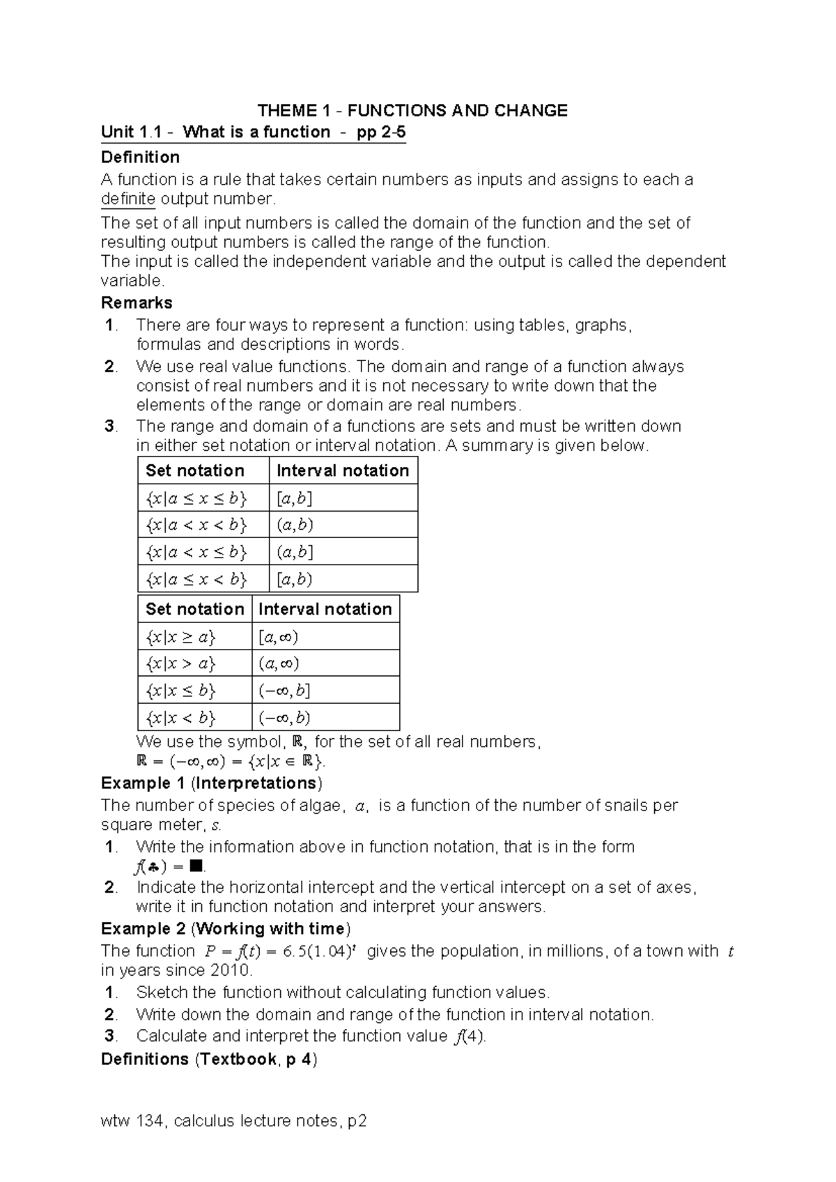WTW 134 Lecture notes Theme 1(2) - THEME 1 - FUNCTIONS AND CHANGE Unit ...