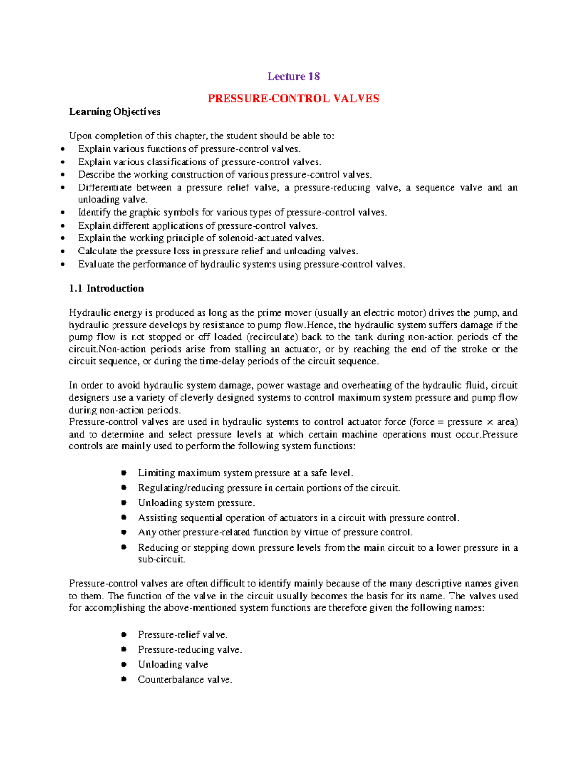 Lecture 18 - Lecture 18 PRESSURE-CONTROL VALVES Learning Objectives ...