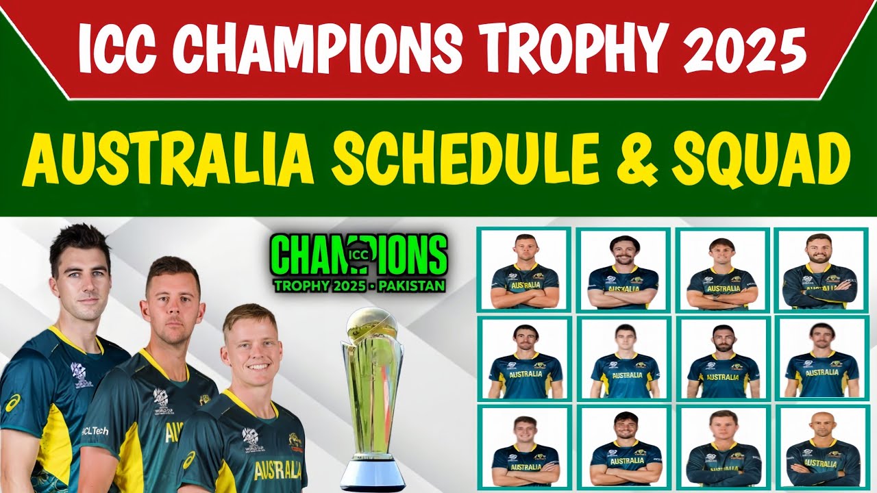 Based on this image's title: “Australia Champions Trophy Squad 2025 & Matches Schedule”