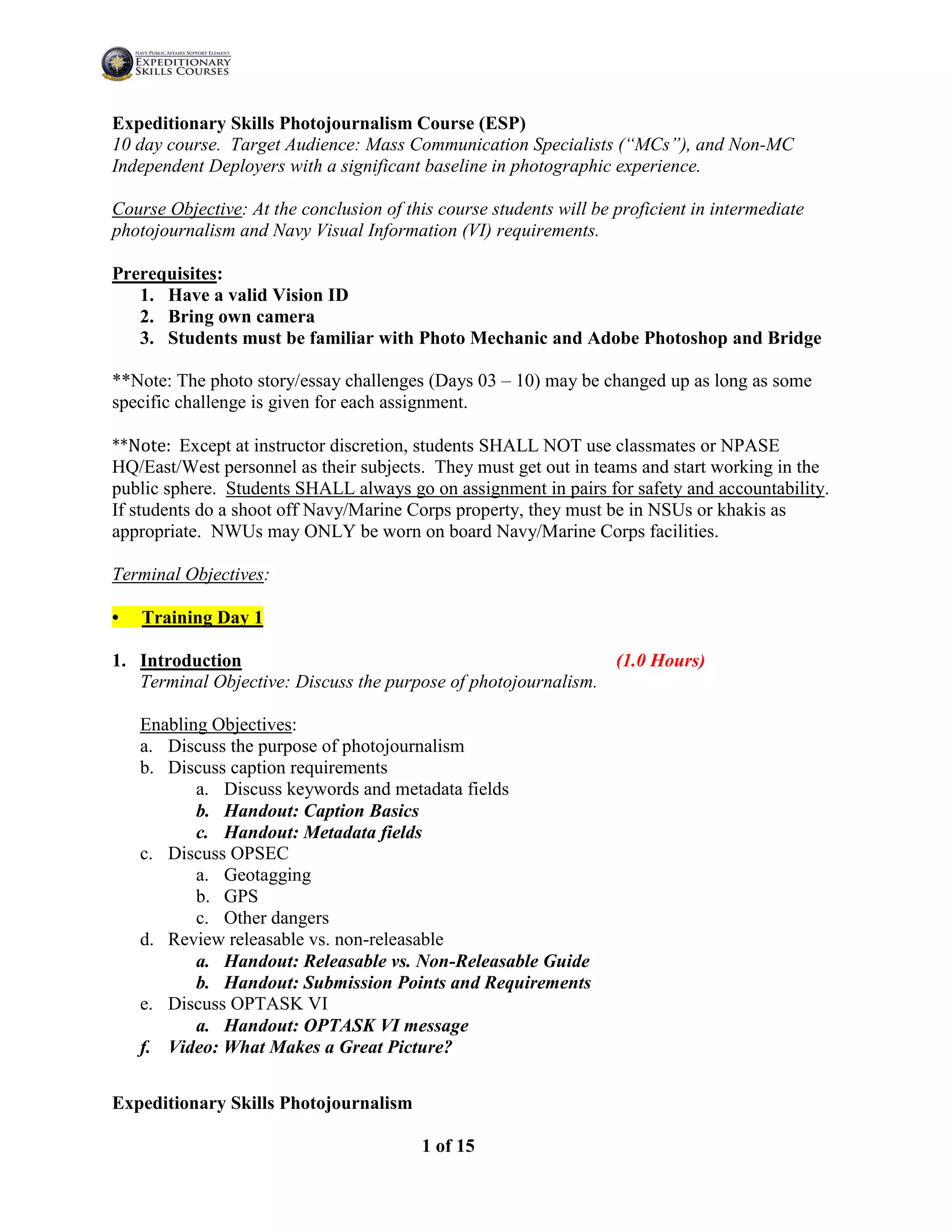 NPASE 2016 Expeditionary Skills Photojournalism Outline | PDF ...