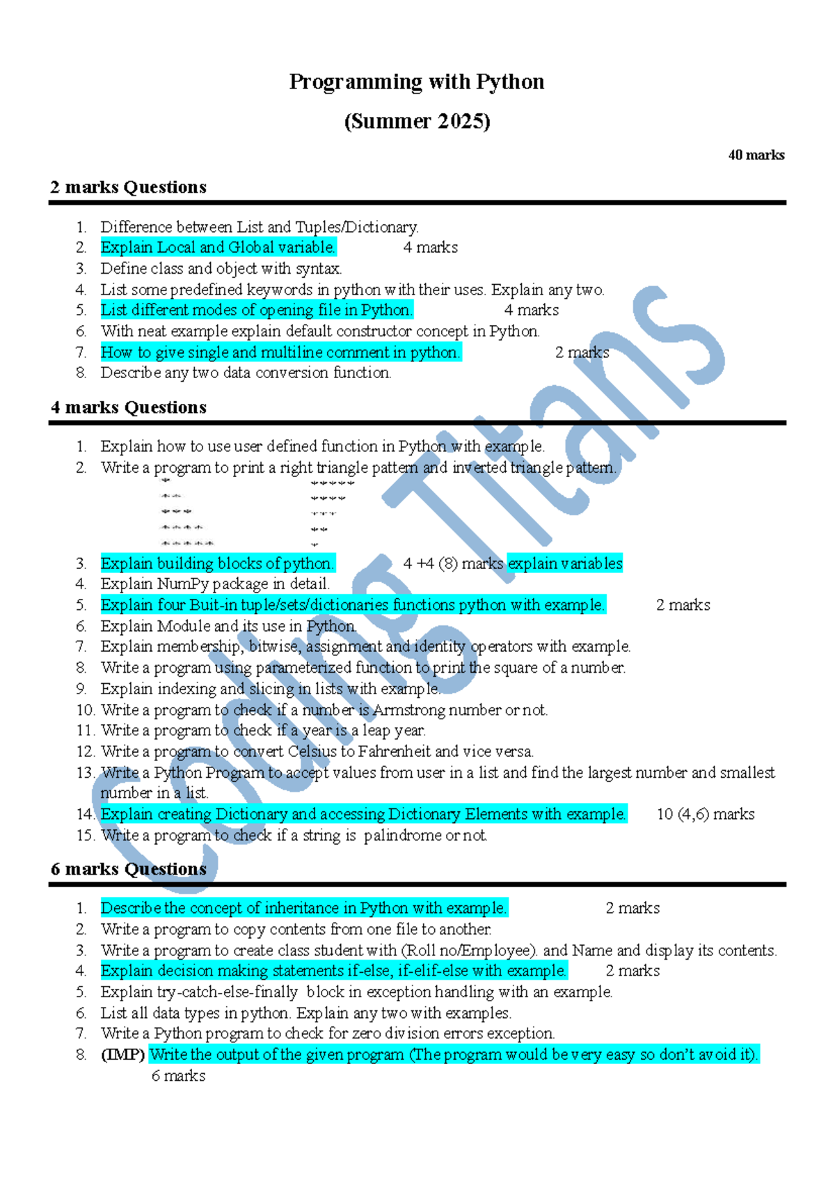 Important Questions for INT108: Python Programming Concepts - Studocu