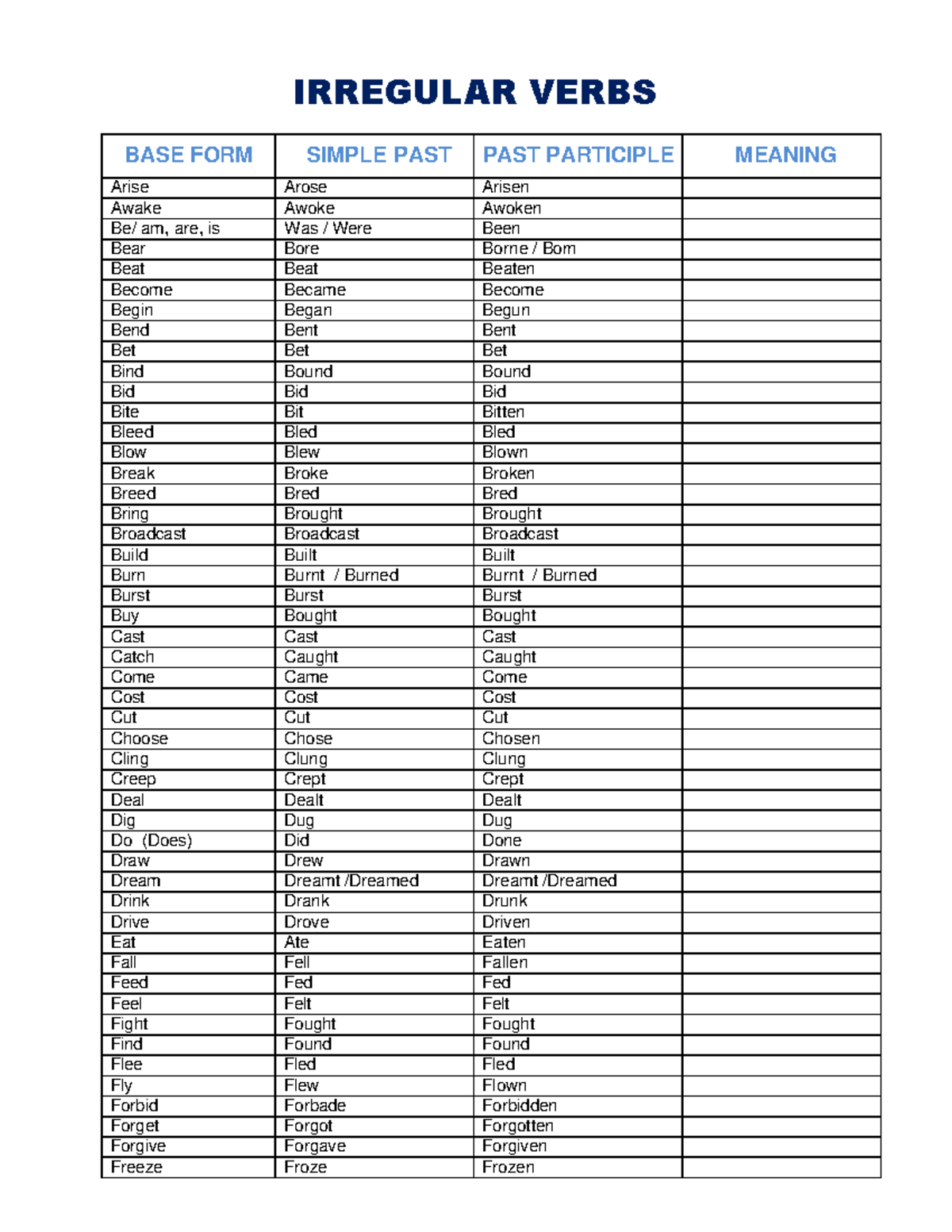 Complete List Of Irregular Verbs In English - Free Printable