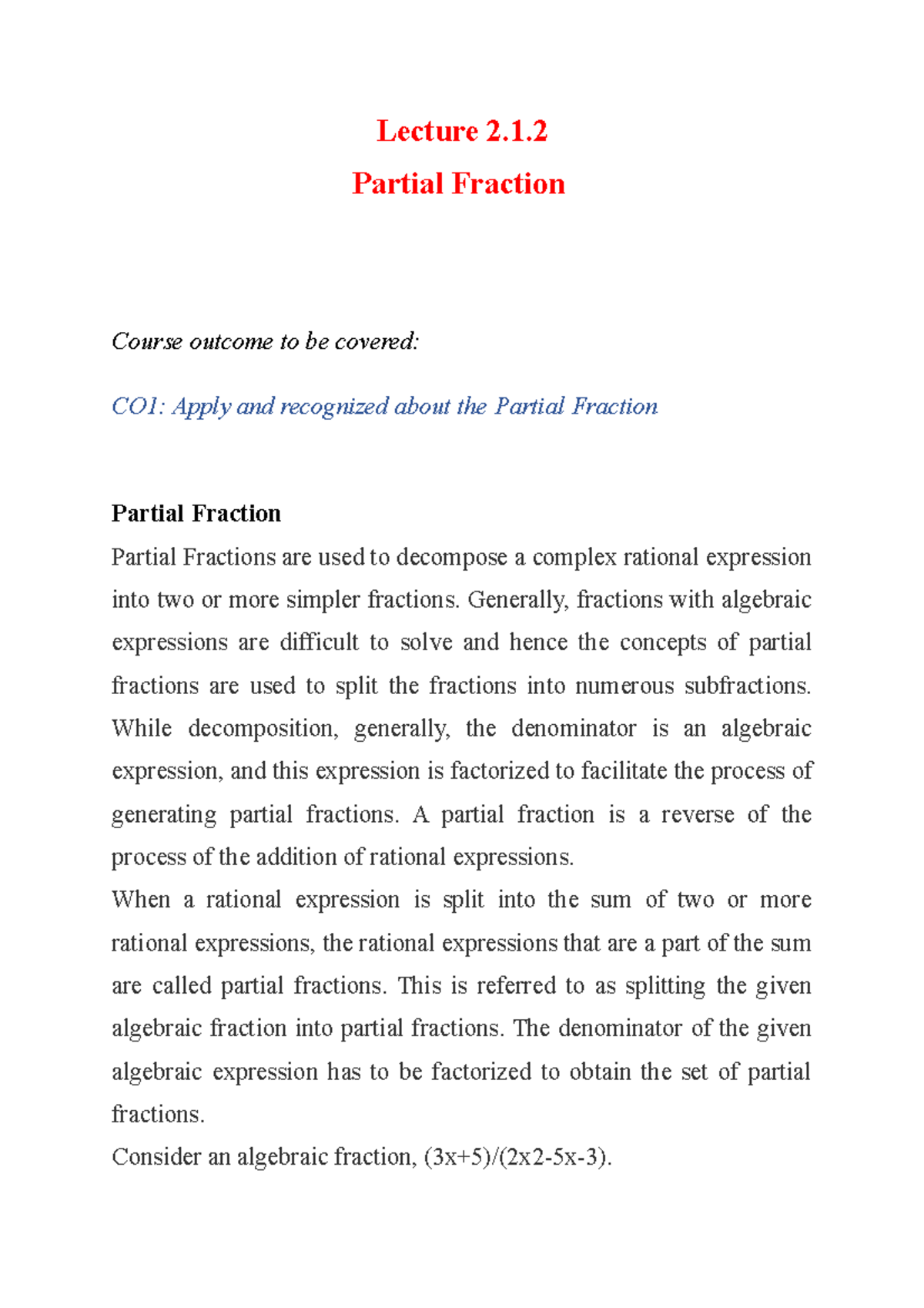 Lecture 2 - Abc - Lecture 2. Partial Fraction Course outcome to be ...