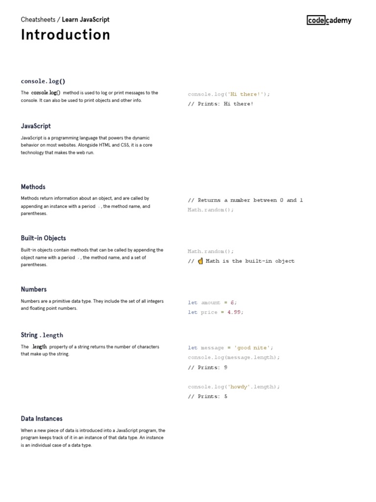Learn JavaScript - Introduction Cheatsheet - Codecademy | PDF | Java ...