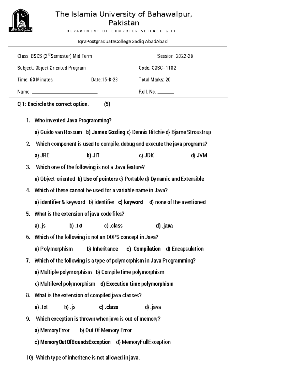 Java - Class: BSCS (2ndSemester) Mid Term Session: 2022- Subject ...