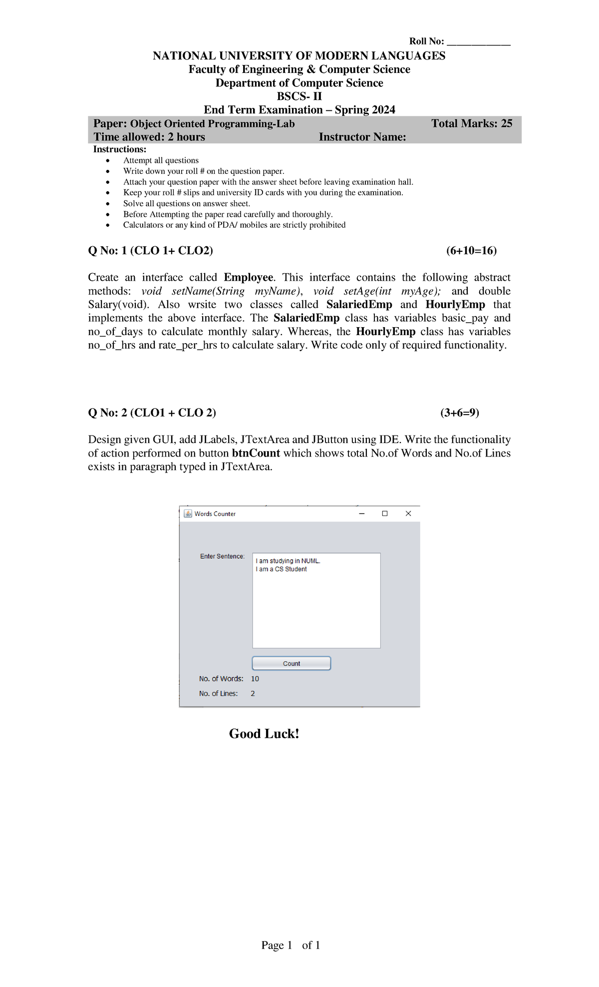 OOP Lab Exam - BSCS II - Spring 2024 - 2nd Semester Paper - Studocu