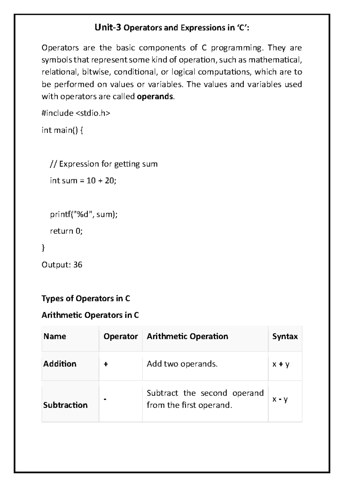 C Programming: Operators and Expressions - Unit 3 Notes - Studocu