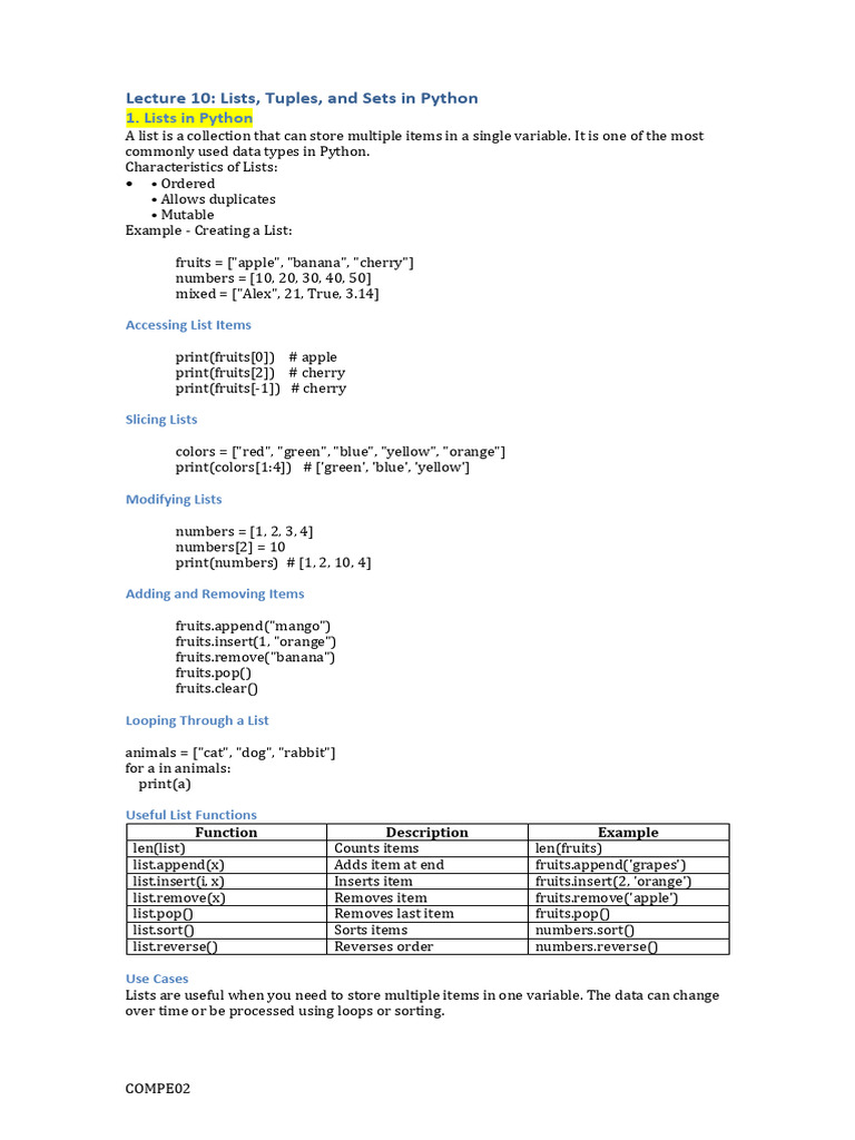 COMPE02 1001 Lecture10 Lists Tuples Sets in Python | PDF | Computer ...