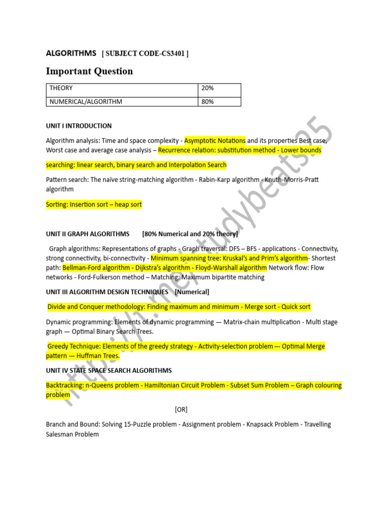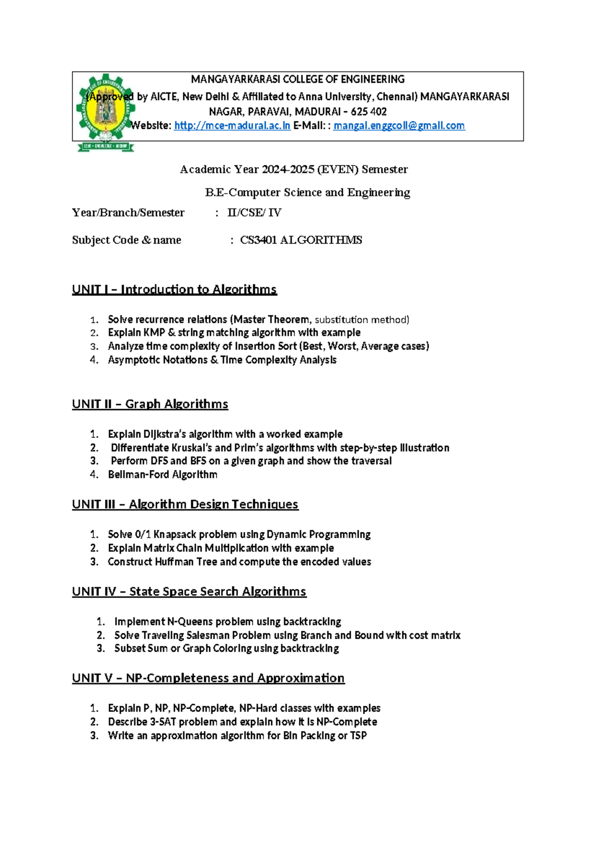 CS3401 Syllabus - Algorithms Course Outline for 2024 - Studocu