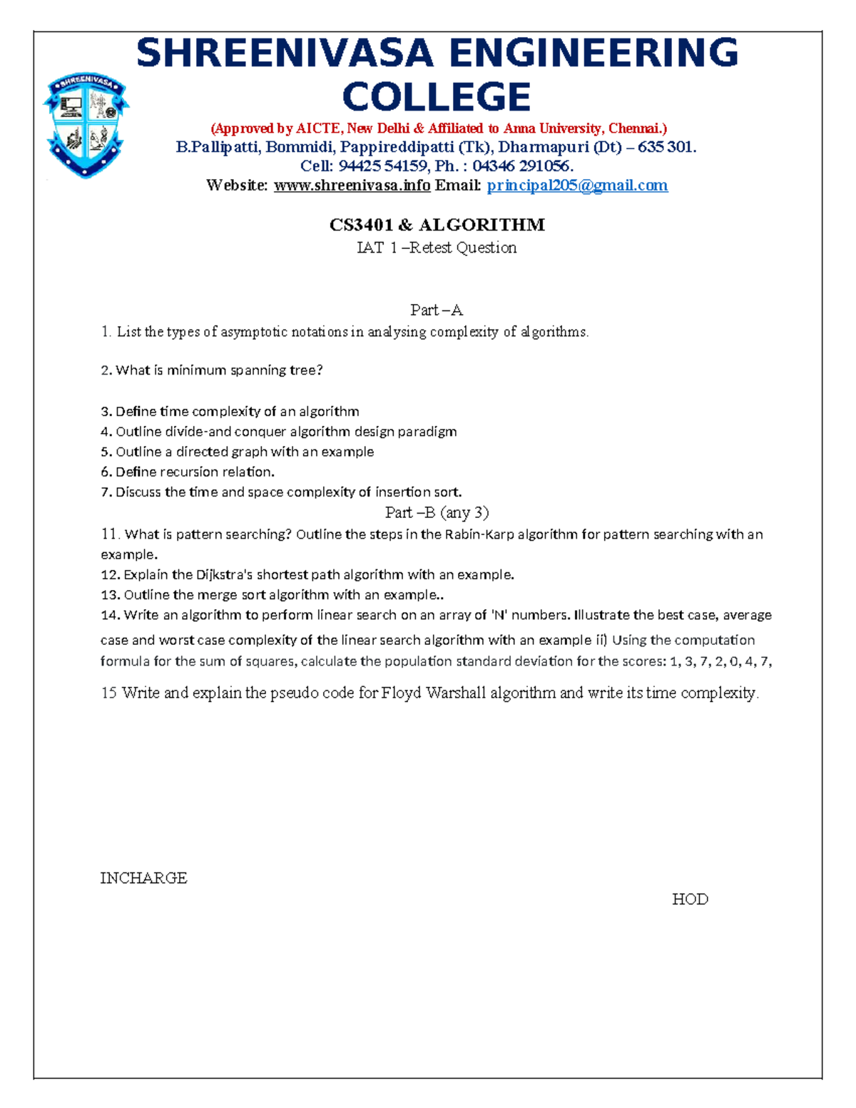 IAT 1 Retest Questions for CS3401: Algorithm Analysis & Design - Studocu