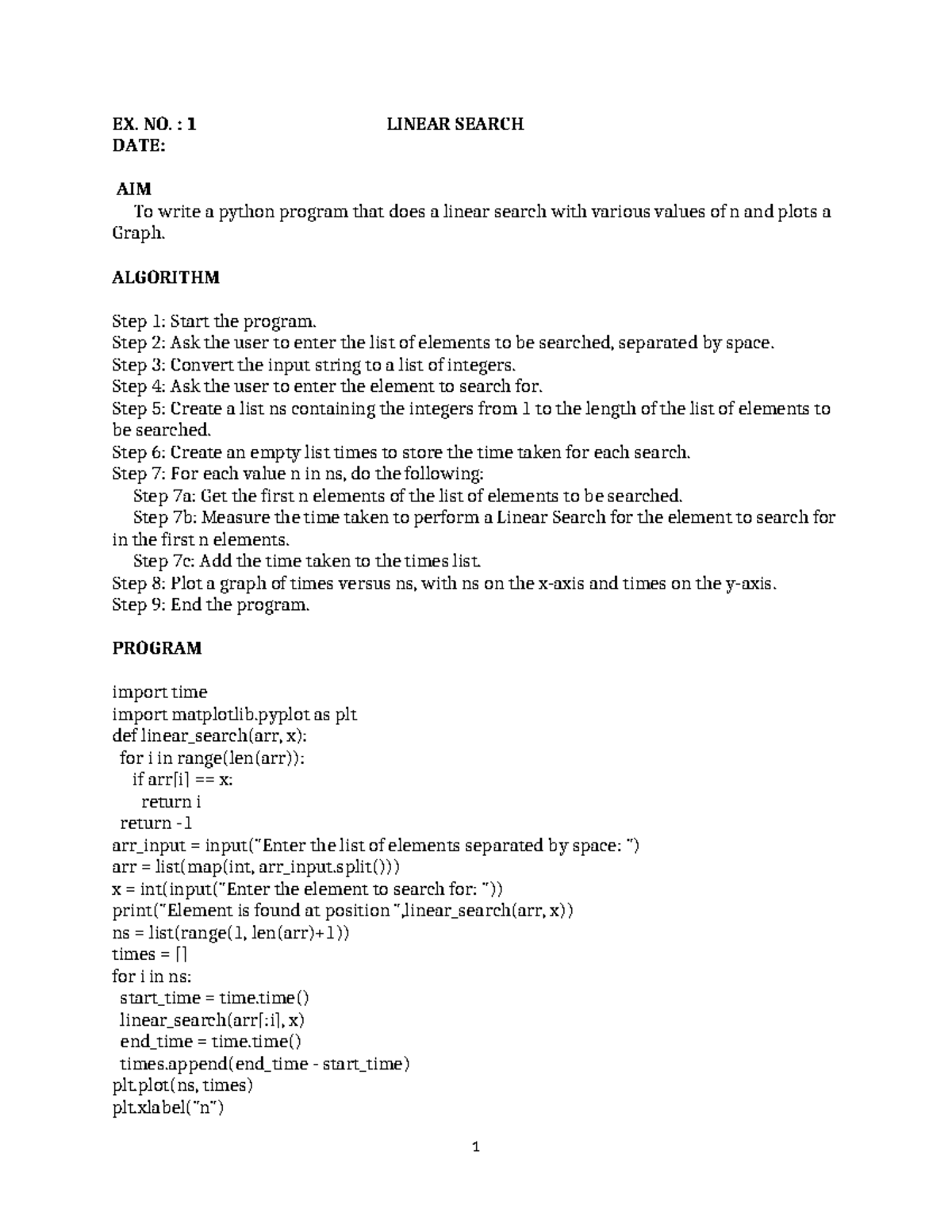 Cs3401 - algorithm - lab manual - EX: 1 LINEAR SEARCH DATE: AIM: To ...