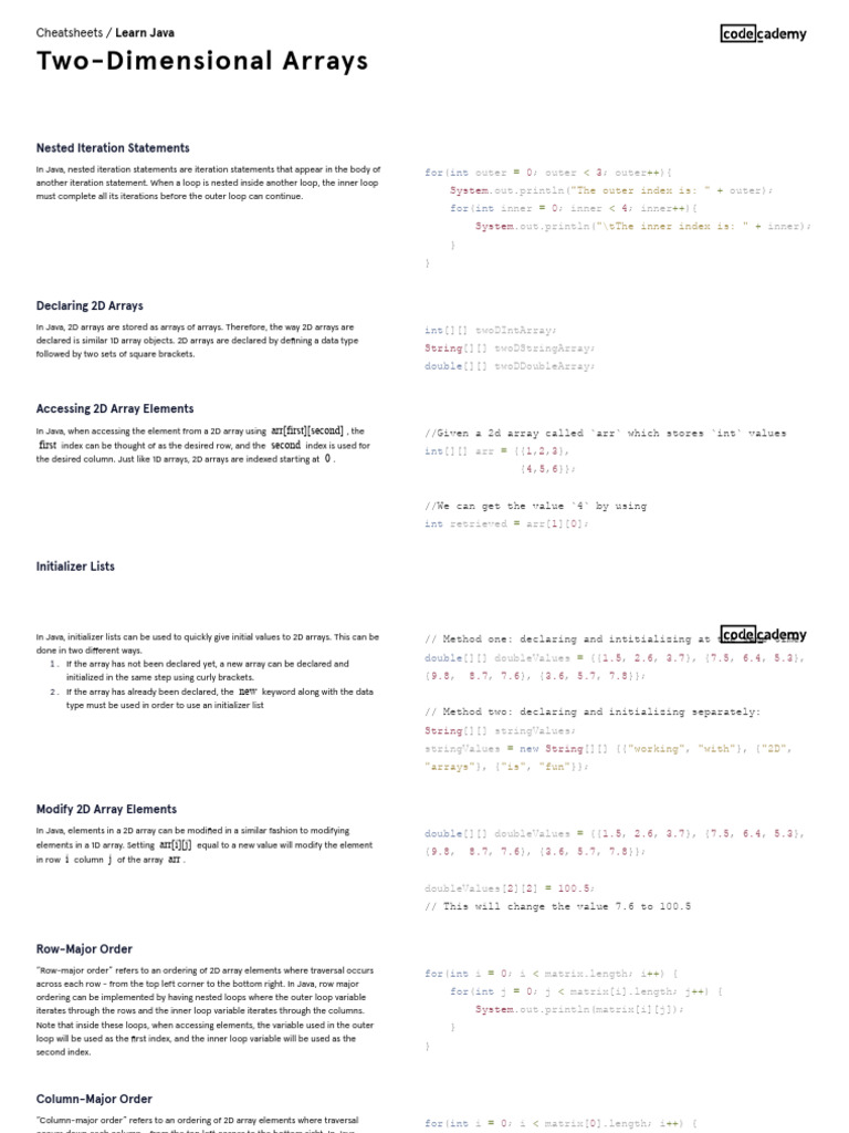 Learn Java - Two-Dimensional Arrays Cheatsheet - Codecademy | PDF ...