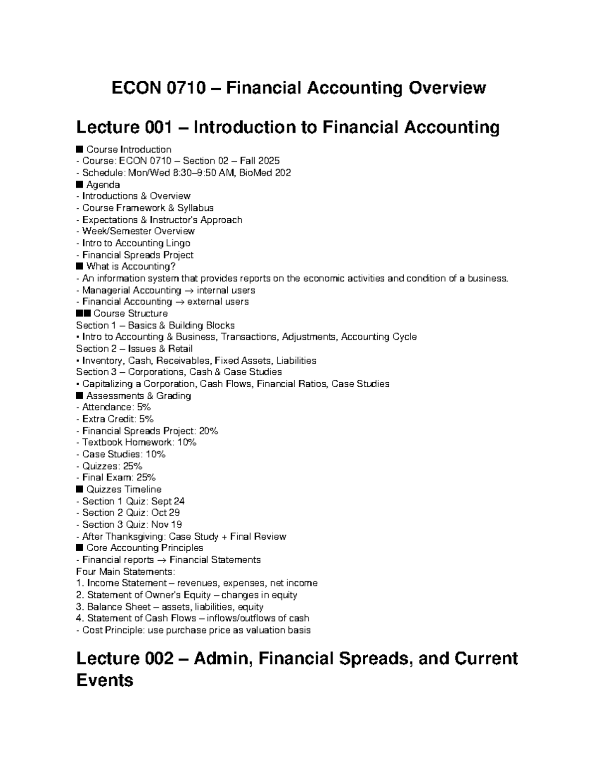 ECON 0710 Financial Accounting Overview Lecture 001 & 002 Study Guide ...
