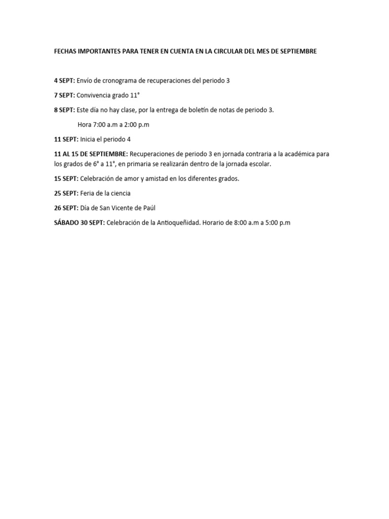 Fechas Importantes para Tener en Cuenta en La Circular Del Mes de ...