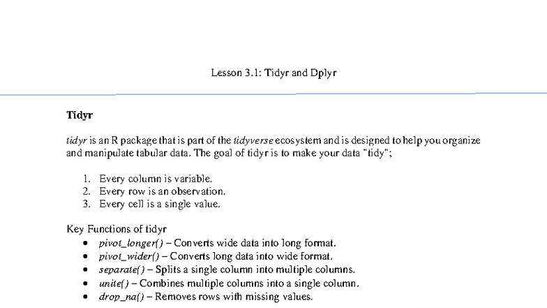 Lesson 3.1: Mastering Tidyr and Dplyr for Data Manipulation - Studocu