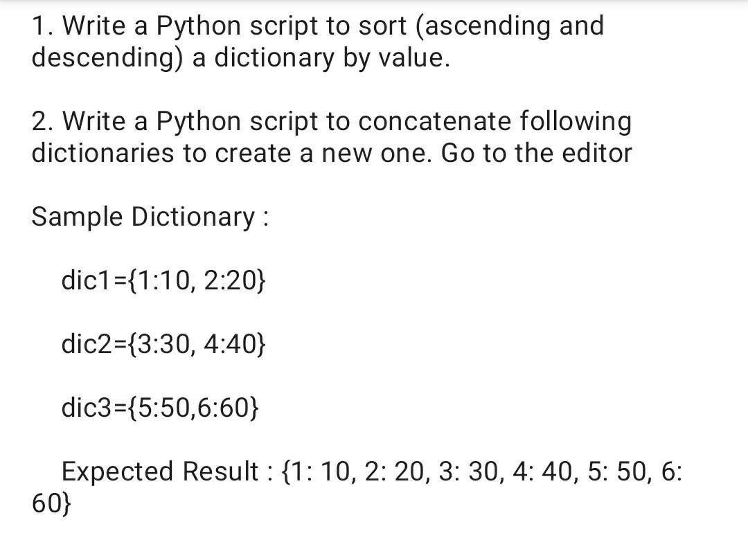Dictionary 1.Write a Python script to sort (ascending and descending) a ...