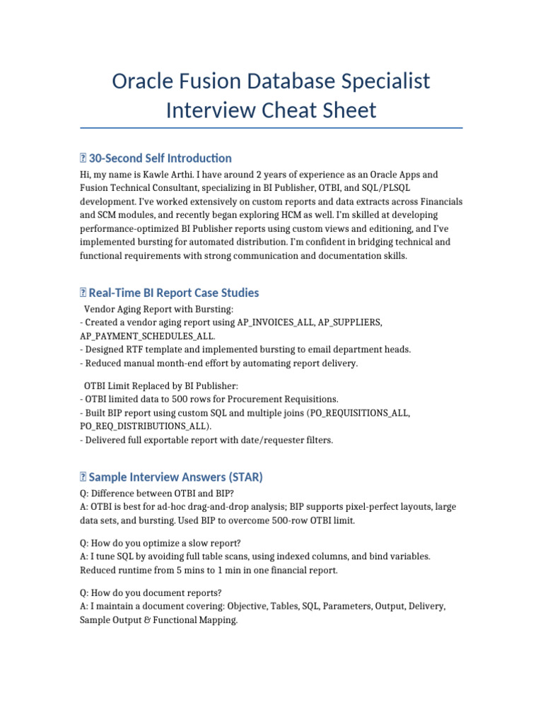 Oracle Fusion Interview CheatSheet Kawle Arthi | PDF