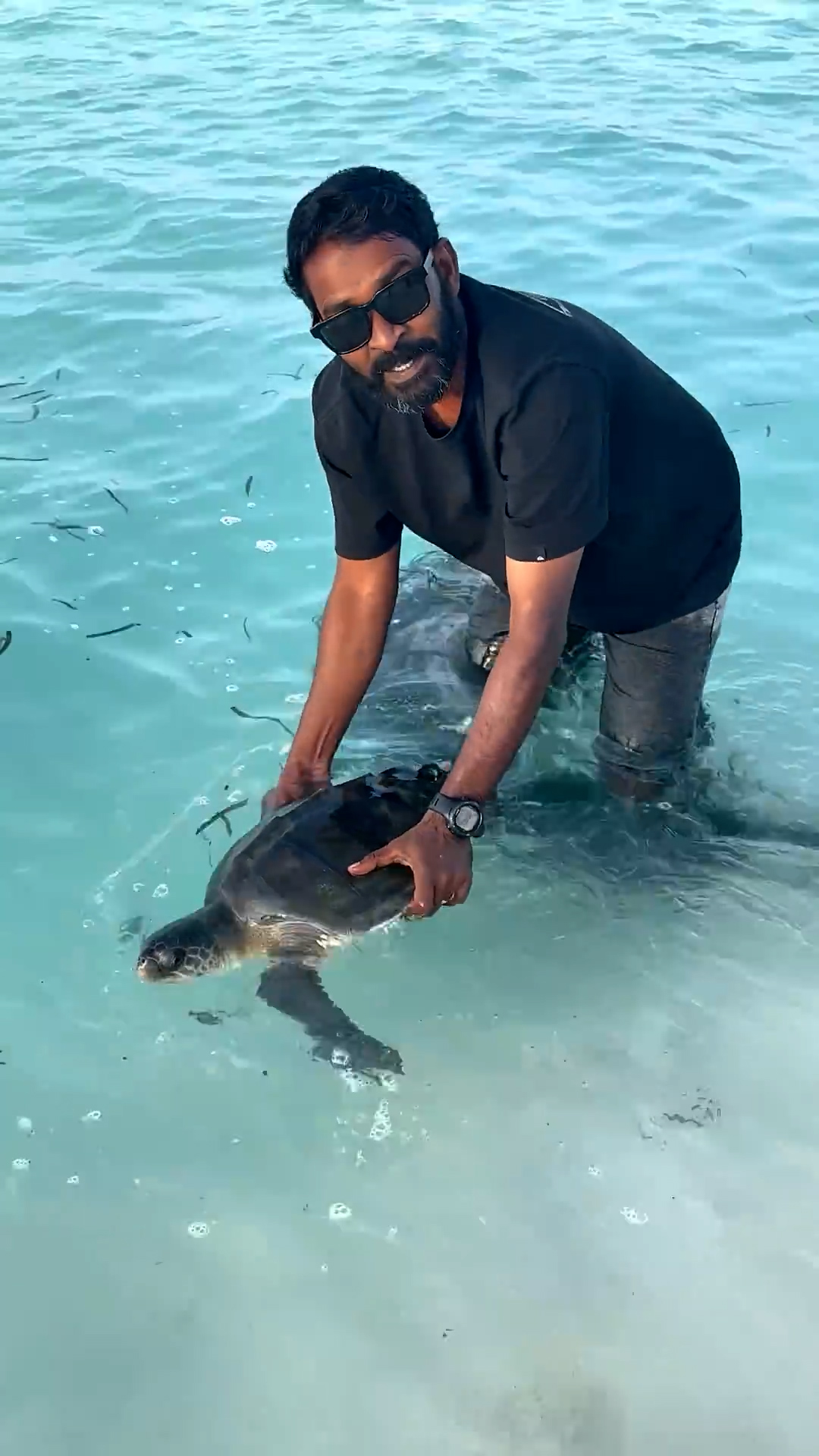 Man frees turtle from net near Maldives shoreline