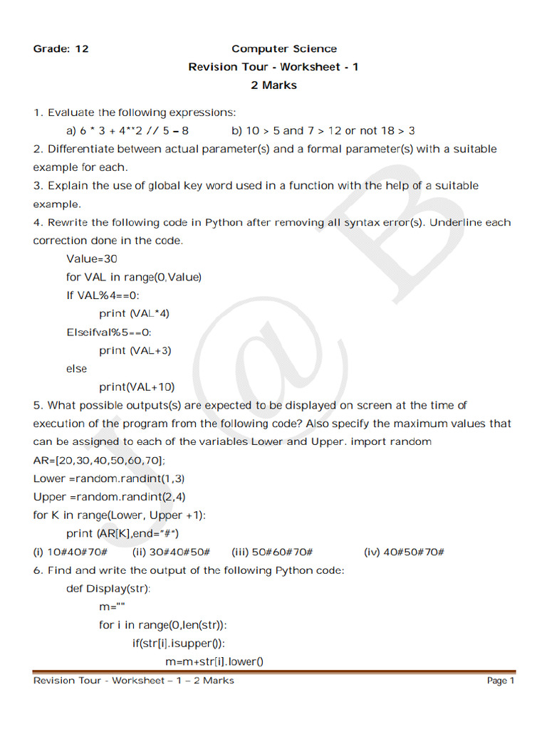 12 CS Python Revision Tour 1&2 Worksheet | Download Free PDF ...